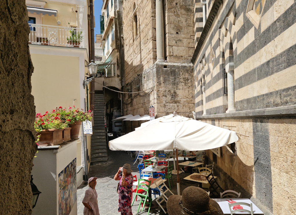Abseits des Doms offenbaren enge Gassen, versteckte Innenhöfe und kleine Plätze das eigentliche Amalfi. Hier zeigt sich eine Stadt, die über Jahrhunderte gewachsen ist, ohne ihre Identität zu verlieren. Historische Gebäude stehen neben schlichten Wohnhäusern, Vergangenheit und Gegenwart existieren selbstverständlich nebeneinander.