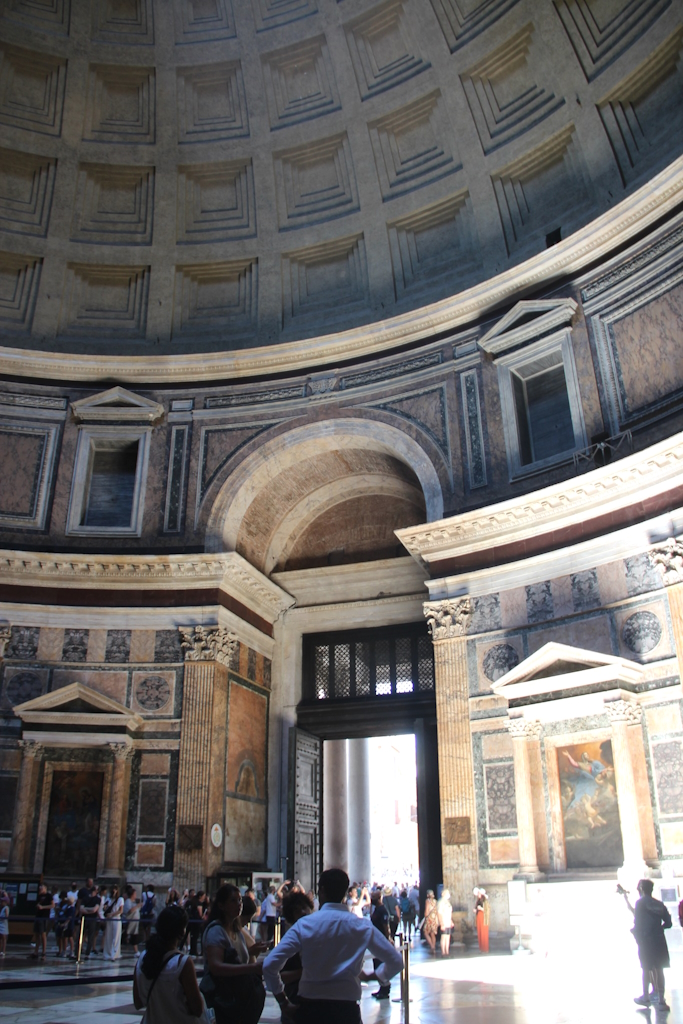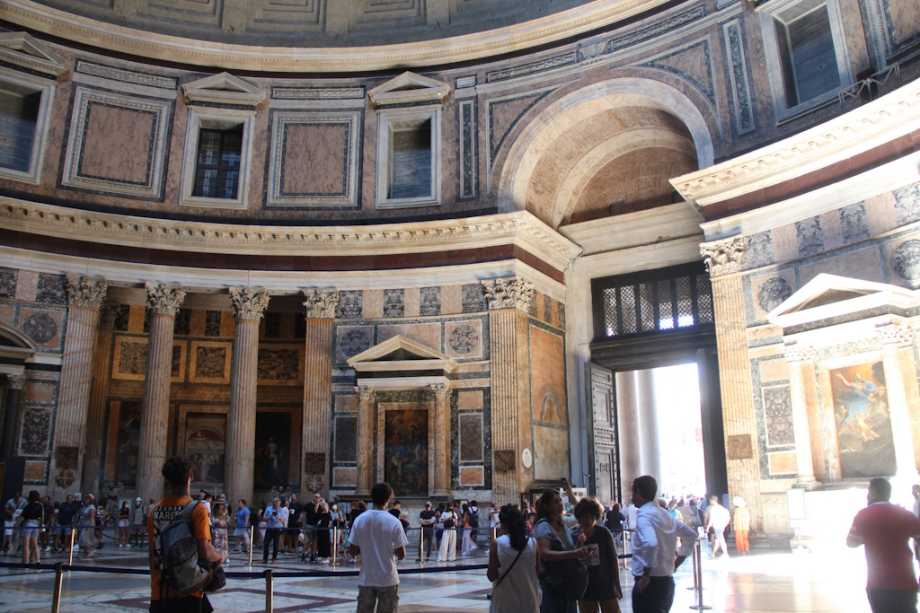 Und genau dort, in der Mitte, klafft ein neun Meter weites Loch: das Oculus. Es ist das Auge des Himmels, durch das das Licht hereinfällt – mal strahlend, mal mystisch, je nach Tageszeit und Wetter. An Regentagen rieselt das Wasser ungehindert auf den Marmorboden – der Clou: ein ausgeklügeltes Entwässerungssystem sorgt dafür, dass der Tempel nicht untergeht.