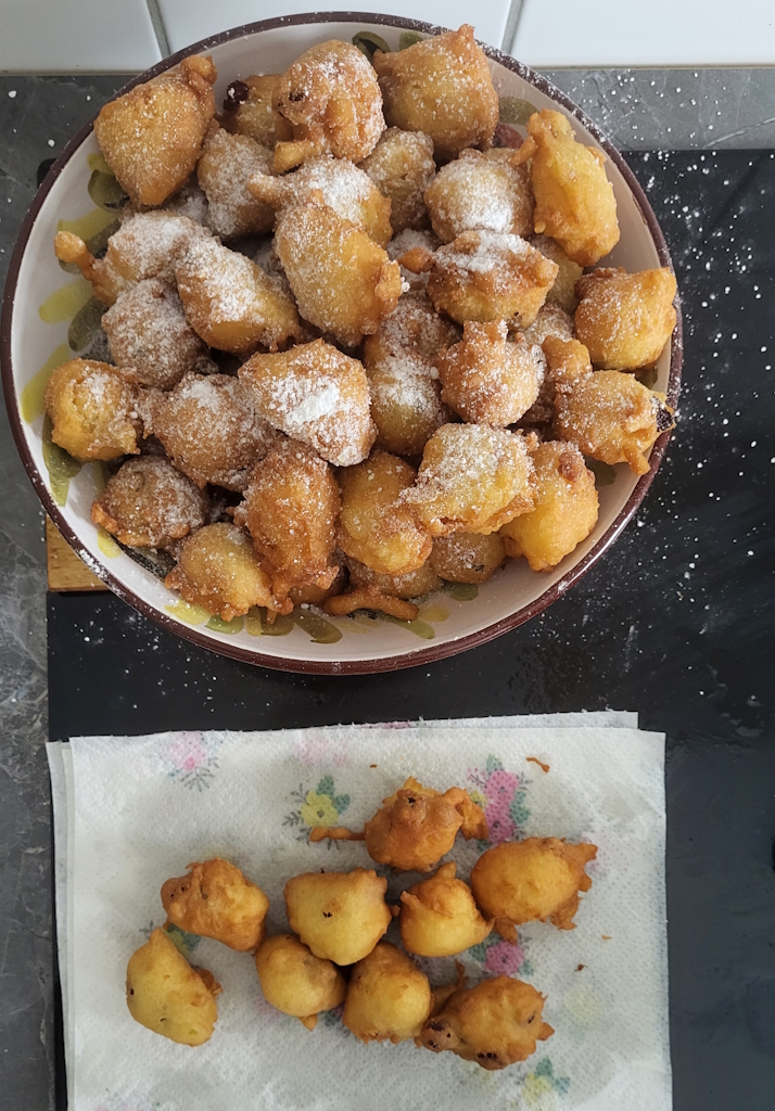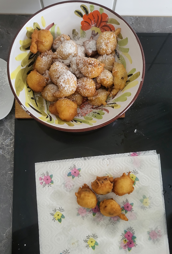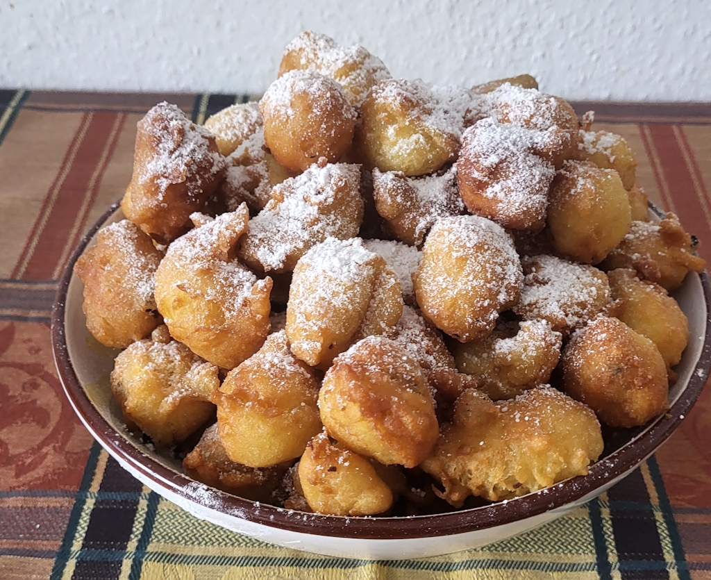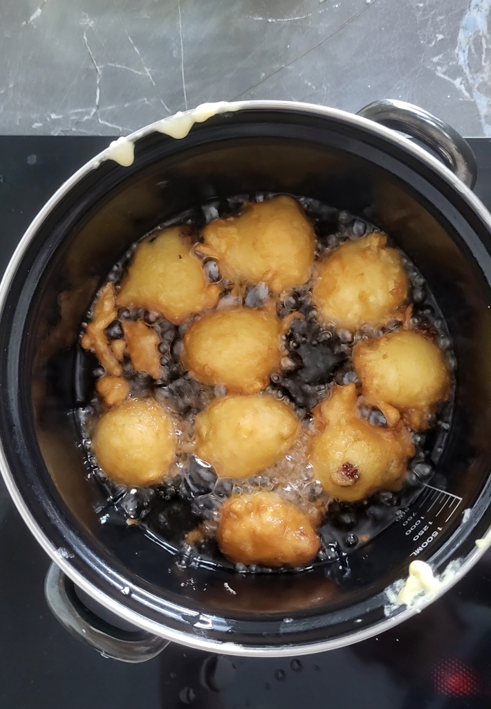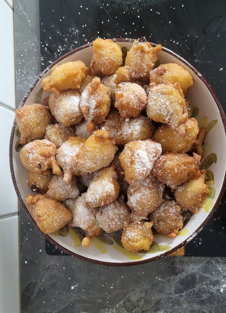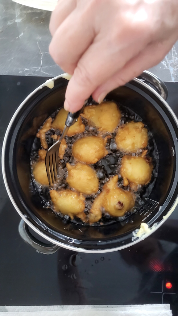 Jetzt geht’s ans Frittieren! Den Teig in heißem Sonnenblumenöl ausbacken, dabei die Bällchen immer schön wenden, bis sie goldbraun und knusprig sind. Dann auf Küchenpapier legen, damit überschüssiges Öl abtropfen kann. Und zum krönenden Abschluss: Mit einer großzügigen Ladung Puderzucker bestäuben!