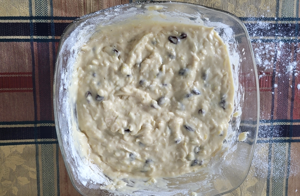 Lass uns loslegen! 30 g Butter schmelzen und mit ½ Glas Milch, 3 Esslöffeln Zucker und einer Prise Salz vermengen. Gut umrühren, dann 2 Eier, 300 g Mehl und 1 Päckchen (15 g) Backpulver hinzufügen. Wichtig: Das Backpulver vorher mit dem Mehl mischen, damit alles schön gleichmäßig aufgeht! Jetzt wird’s spannend – ein Glas Rosinen, 2 grob geriebene Äpfel und die abgeriebene Schale einer Zitrone unterrühren. Alles ordentlich vermischen. Der Teig sollte schön weich sein – wie Pfannkuchenteig. Falls nötig, einfach noch etwas Mehl dazugeben.