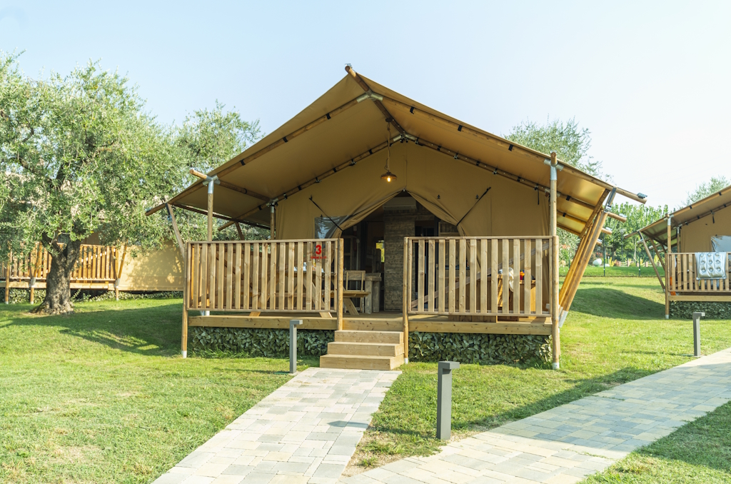 Glamping-Bereich im Camping Village La Rocca am Gardasee: Natur, Komfort und moderne Unterkünfte in ruhiger Umgebung. (Foto: © Lago di Garda Camping)