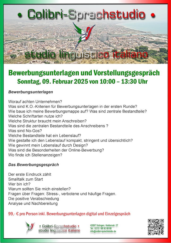 Neben den sprachlichen Angeboten bietet das Colibri-Sprachstudio am Sonntag, den 09. Februar 2025, von 10.00 bis 13.30 Uhr einen Workshop zum Thema Bewerbung an. Dieser Kurs, ebenfalls geleitet von Rosario Lo Vacco und unterstützt von Manu Shareghi, richtet sich nicht speziell auf die italienische Sprache, sondern vermittelt universelle Fähigkeiten für den Bewerbungsprozess. Teilnehmer lernen, professionelle Bewerbungsunterlagen zu erstellen und Vorstellungsgespräche souverän zu meistern. Wertvolle Tipps zur Struktur eines Lebenslaufs, zur Gestaltung eines ansprechenden Designs und zur Selbstpräsentation runden das Programm ab. Die Teilnahmegebühr beträgt 99 Euro, inklusive digitaler Unterlagen und persönlichem Feedback.