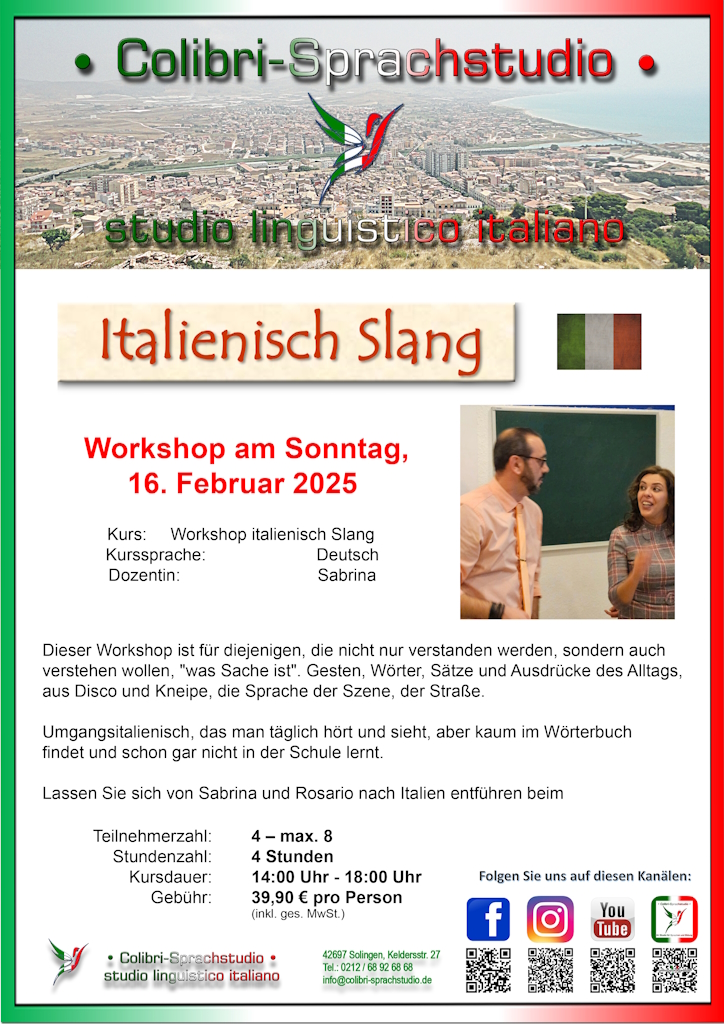 Am Sonntag, den 16. Februar 2025, findet von 14.00 bis 18.00 Uhr ein Workshop zur italienischen Umgangssprache statt. Dieser Kurs, geleitet von Sabrina Vitale und unterstützt von Rosario Lo Vacco, richtet sich an Interessierte, die einen Einblick in den authentischen Alltag Italiens erhalten möchten. Dabei werden gängige Gesten, Redewendungen und Ausdrücke aus der Alltagssprache, Disco und Kneipe vermittelt, die in keinem Wörterbuch zu finden sind. Die Teilnahmegebühr beträgt 39,90 Euro pro Person.