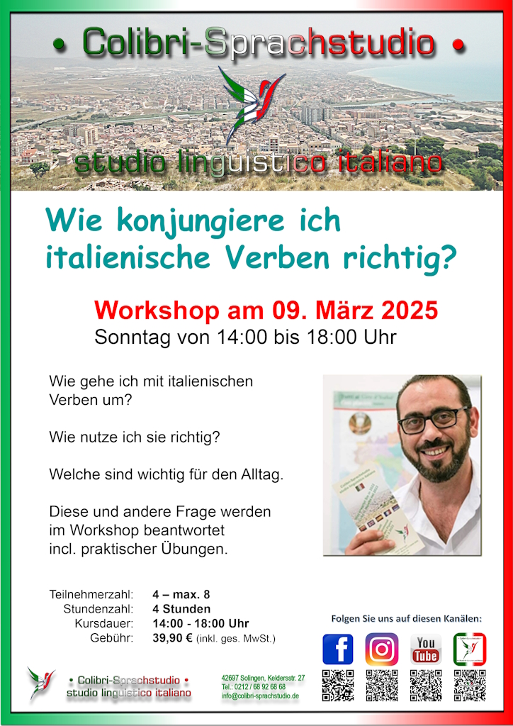 Am Sonntag, den 09. März 2025, von 14.00 bis 18.00 Uhr, bietet Rosario Lo Vacco, Inhaber des Sprachstudios, praktische Anleitungen zur korrekten Konjugation italienischer Verben. Neben den theoretischen Grundlagen stehen vor allem praktische Übungen im Vordergrund, die Unsicherheiten im Sprachgebrauch beseitigen und die Anwendung der Sprache im Alltag erleichtern sollen. Die Kosten für die Teilnahme betragen 39,90 Euro.