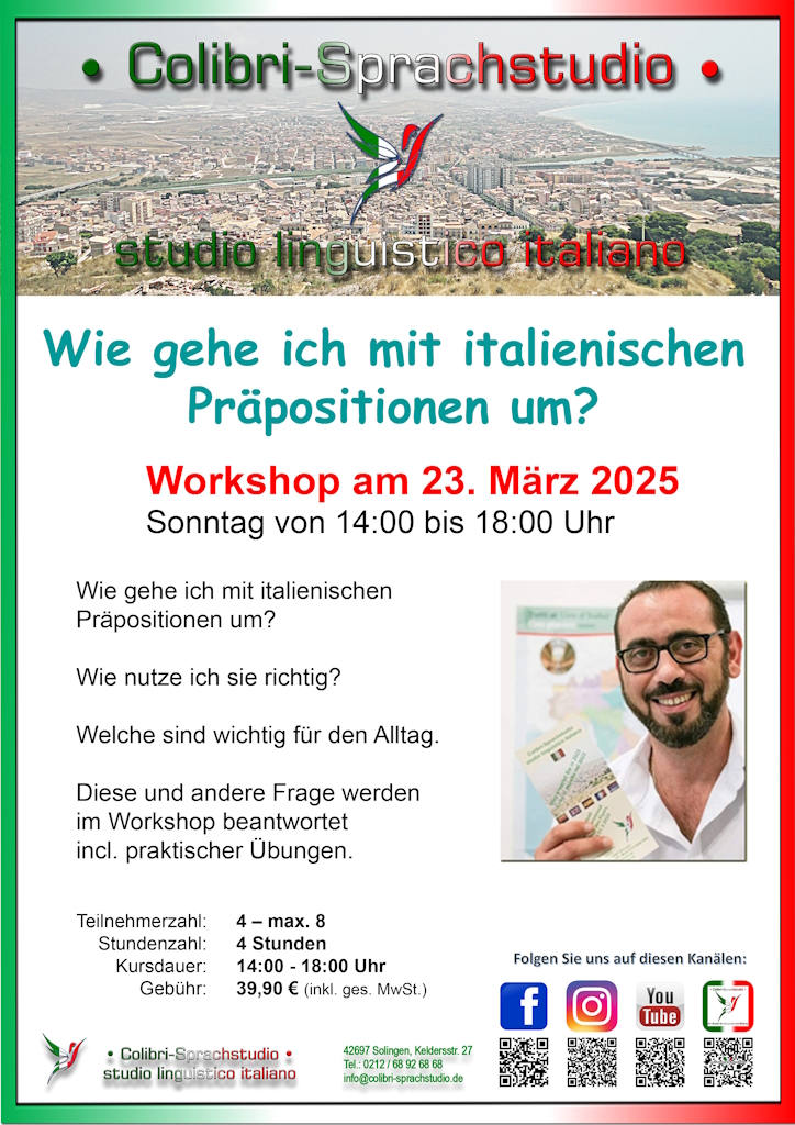 Am Sonntag, den 23. März 2025, ebenfalls von 14:00 bis 18:00 Uhr, widmet sich Rosario Lo Vacco den häufig komplizierten grammatikalischen Feinheiten der italienischen Präpositionen. Ziel des Workshops ist es, die Teilnehmer dabei zu unterstützen, Präpositionen sicher und korrekt zu verwenden. Praktische Übungen sorgen dafür, dass die Sprache leichter im Alltag angewendet werden kann. Die Teilnahmegebühr beträgt 39,90 Euro.