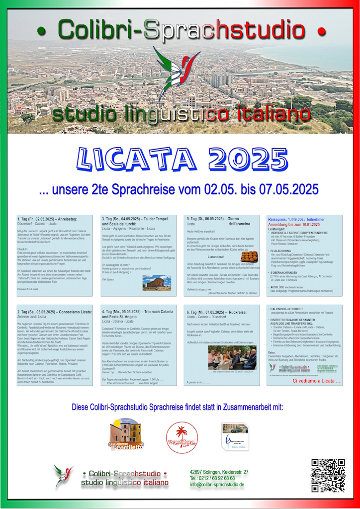 Vom 2. bis 7. Mai 2025 organisiert das Colibri-Sprachstudio eine Sprachreise in die sizilianische Küstenstadt Licata. Geleitet von Rosario Lo Vacco, bietet die Reise eine perfekte Kombination aus intensivem Italienischunterricht, spannenden Ausflügen zu kulturellen Highlights wie dem Tal der Tempel und kulinarischen Erlebnissen wie dem „Tag der Arancino“. Teilnehmer können ihre Sprachkenntnisse in einem authentischen Umfeld vertiefen und Sizilien aus nächster Nähe erleben. Die Reisekosten betragen 1.449 Euro pro Person, inklusive Unterkunft, Unterricht, Ausflügen und Flügen.