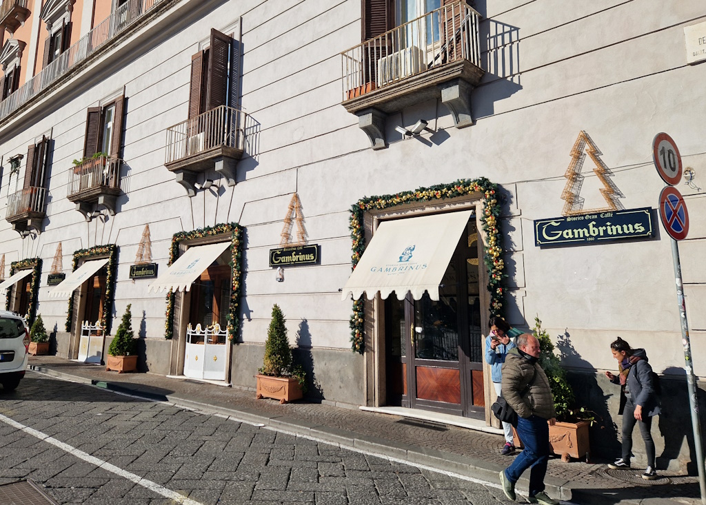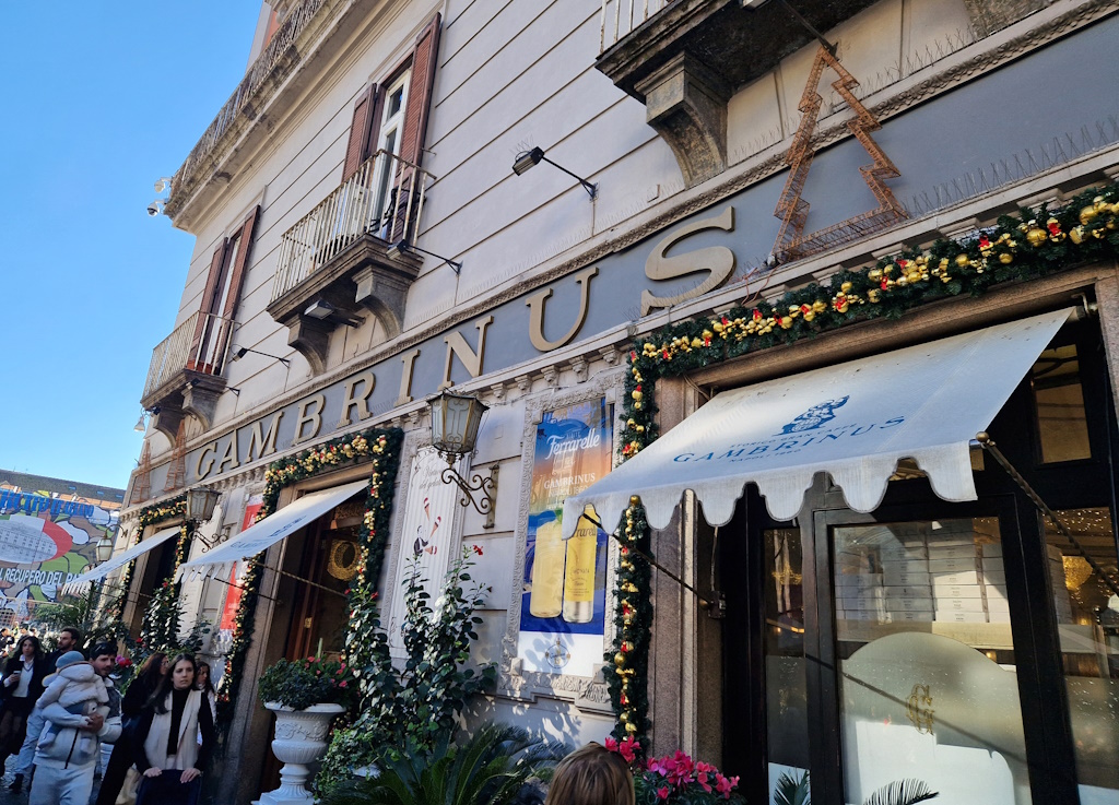 Die Position des Cafés ist kein Zufall. Direkt an der Via Chiaia gelegen, an der Piazza Trieste e Trento und nur wenige Schritte von der Piazza del Plebiscito, dem Teatro San Carlo und dem Palazzo Reale entfernt, versteht sich das Gambrinus als repräsentatives Wohnzimmer der Stadt. Wer hier Platz nimmt, sitzt nicht abseits, sondern mitten im urbanen Geschehen Neapels.
