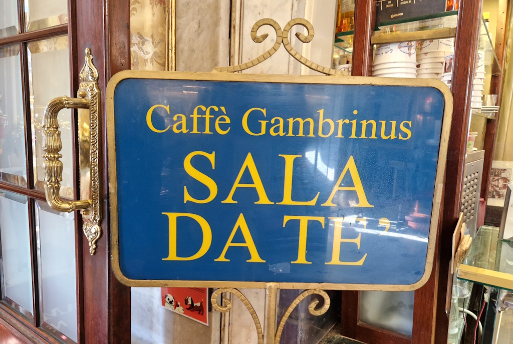 Bis 1938 blieb das Gambrinus ein zentraler Ort des öffentlichen Lebens. In jenem Jahr wurde das Café aus politischen Gründen geschlossen, ein Einschnitt, der seine Geschichte nachhaltig prägte. Erst Jahrzehnte später begann die schrittweise Wiederbelebung. Heute knüpft das Gambrinus bewusst an seine Vergangenheit an und inszeniert sich als historisches Kaffeehaus. Die jüngste Restaurierung der Sala degli Specchi, des Spiegelsaals, macht diesen Anspruch besonders sichtbar und rückt den ursprünglichen Glanz erneut in den Mittelpunkt.