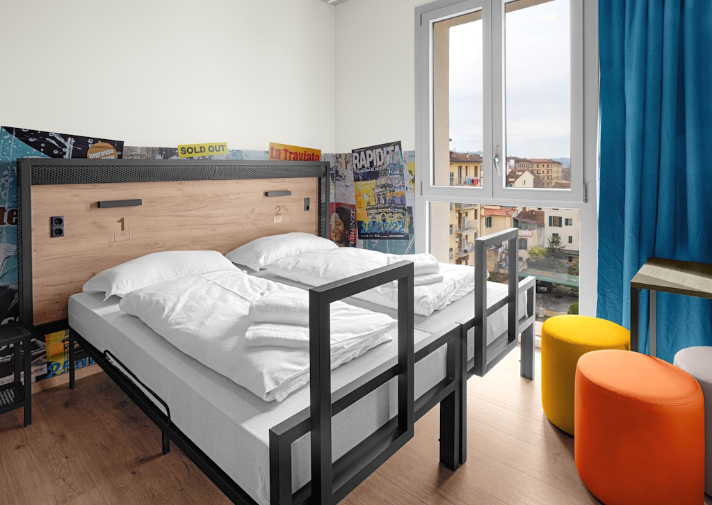 Das ehemalige Bürogebäude aus den 1960er Jahren wurde umfassend renoviert. Besonders hervorzuheben sind die KI-generierten Wandpaneele, die in den Zimmern nicht nur für eine einzigartige Optik sorgen, sondern auch als Schutz dienen. Zudem setzt das Hostel auf nachhaltige Technologien. Photovoltaik- und Solarthermieanlagen auf dem Dach erzeugen umweltfreundlich Strom und Heißwasser, während Luft-Wasser-Klimaanlagen für eine effiziente Raumtemperierung sorgen. Auch die Reinigungsprozesse im Haus sind auf Innovation ausgelegt, denn in Lobby und Fluren sorgen industrielle Reinigungsroboter für Sauberkeit. Gäste haben außerdem die Möglichkeit, digitale Schlüssel über die a&o-App zu nutzen.