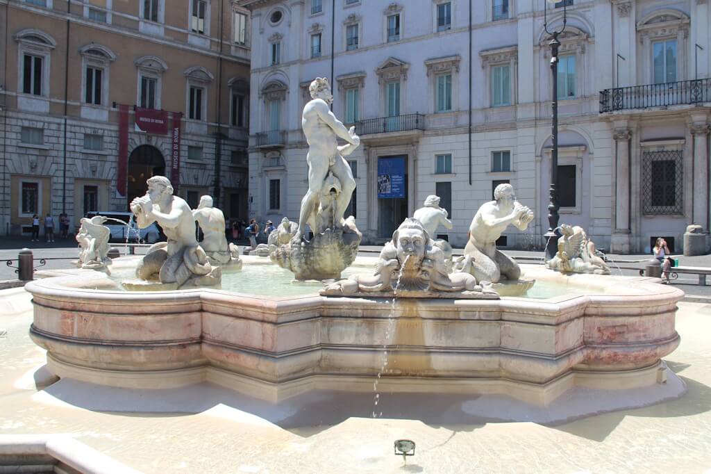 Ein zentrales Highlight der Piazza Navona ist der Vierströmebrunnen (Fontana dei Quattro Fiumi) in der Mitte des Platzes. Dieser beeindruckende Brunnen wurde von dem berühmten Bildhauer Gian Lorenzo Bernini entworfen und symbolisiert die vier großen Flüsse der damaligen bekannten Welt: den Nil, die Donau, den Ganges und den Río de la Plata. Jede Figur des Brunnens repräsentiert eines dieser Flussgebiete, und die lebhafte und detaillierte Darstellung der Figuren zeigt die Meisterschaft von Bernini. Der Obelisk in der Mitte des Brunnens wurde ursprünglich aus Ägypten nach Rom gebracht und verleiht dem Werk eine zusätzliche historische Tiefe.