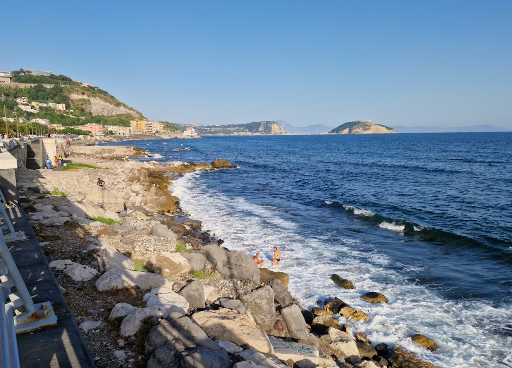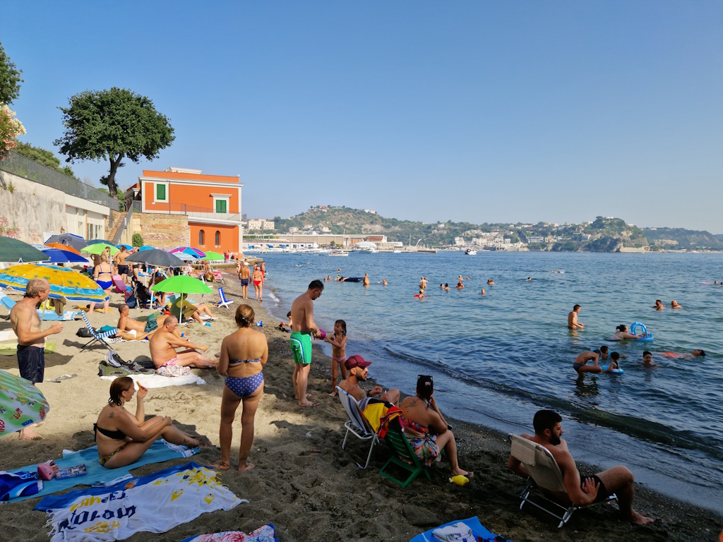 Wer eine Insel besuchen möchte, sollte lieber nach Ischia oder Capri fahren – dort ist es sicherer. Wir entschieden uns für den Strand von Pozzuoli. Der Juli war heiß, schon nach neun Uhr morgens war es kaum auszuhalten. Wir standen um sechs Uhr auf, frühstückten schnell und fuhren zum Strand – das Auto war bedeckt mit dem Sand, den der lokale Wind „Siracusano“ bringt.