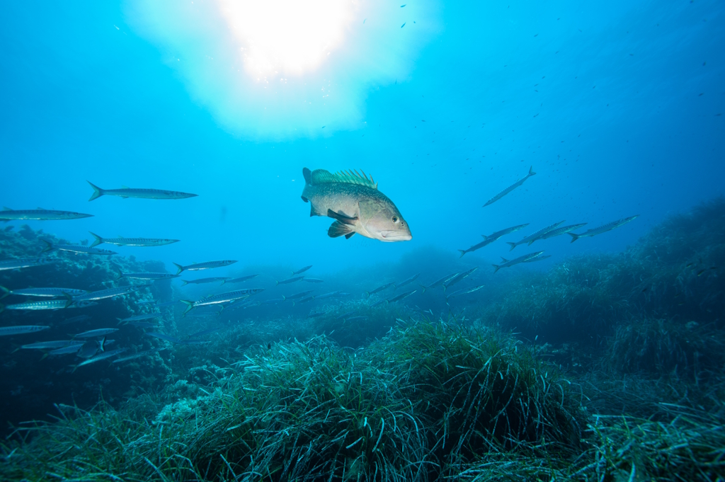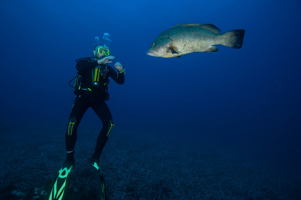 Begegnung über einer Seegraswiese vor Elba: Die Unterwasserwelt der Insel zeichnet sich durch eine bemerkenswert hohe Artenvielfalt aus. (Foto: © „Spiro Sub Diving – Elba“)